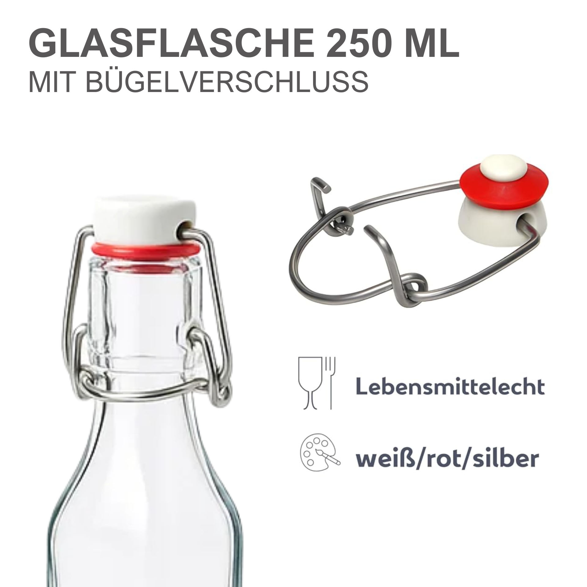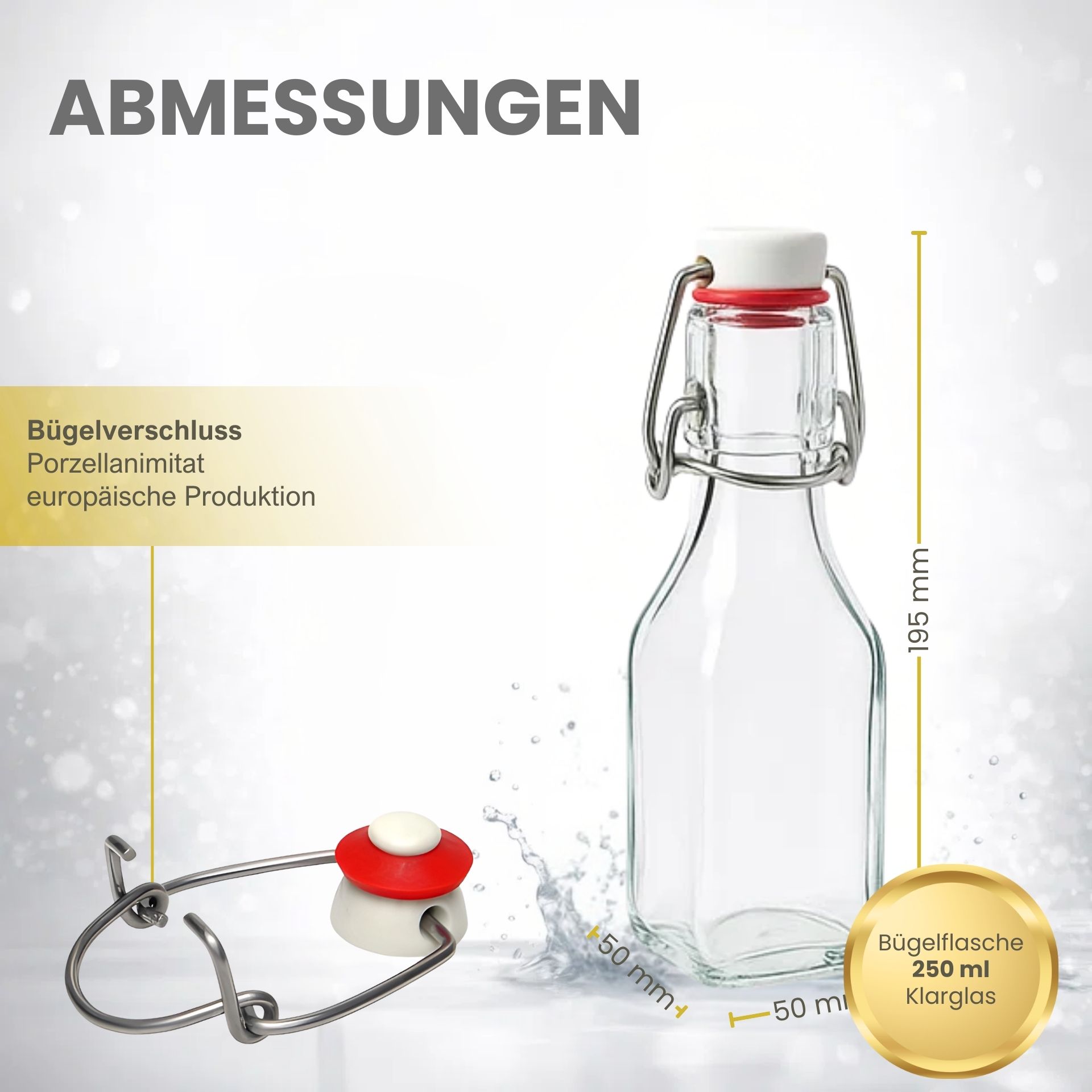 6er-Set eckiger Glasflaschen mit 250 ml Fassungsvermögen und stabilem Bügelverschluss. Ideal zum Abfüllen von Säften, Sirup, Öl, Likör oder fermentierten Getränken. Der Drahtbügelverschluss aus Metall und Kunststoff mit Dichtung sorgt für einen luftdichten Verschluss und bewahrt Frische und Aroma.