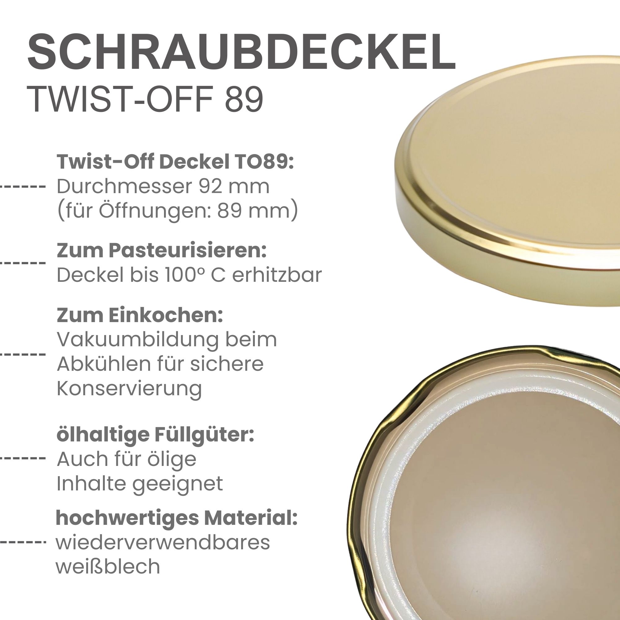 - Twist-Off-Deckel TO 89: Goldfarben, luftdicht verschließend und erhitzbar bis 100 °C – ideal zum Pasteurisieren.