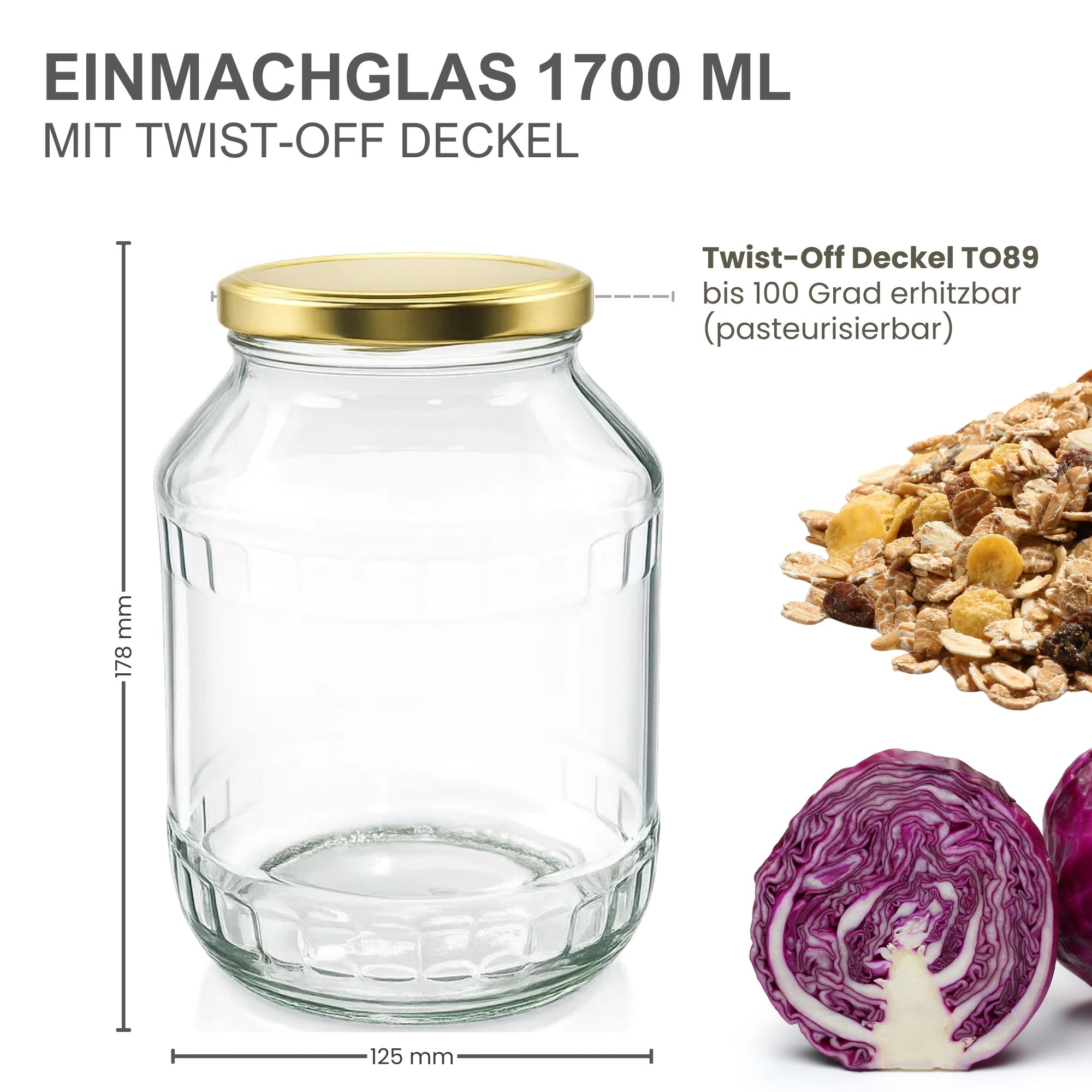 - 6 Einmachgläser (1700 ml): Extra großes Volumen – perfekt für Gurken, Sauerkraut, Bohnen, Kompotte oder Suppen.