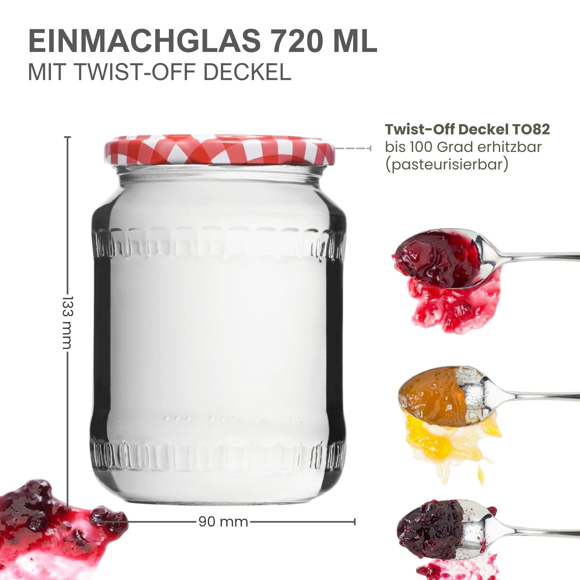 - Deckel: Twist-Off-Schraubdeckel TO 82, hitzebeständig bis 100 °C, luftdicht