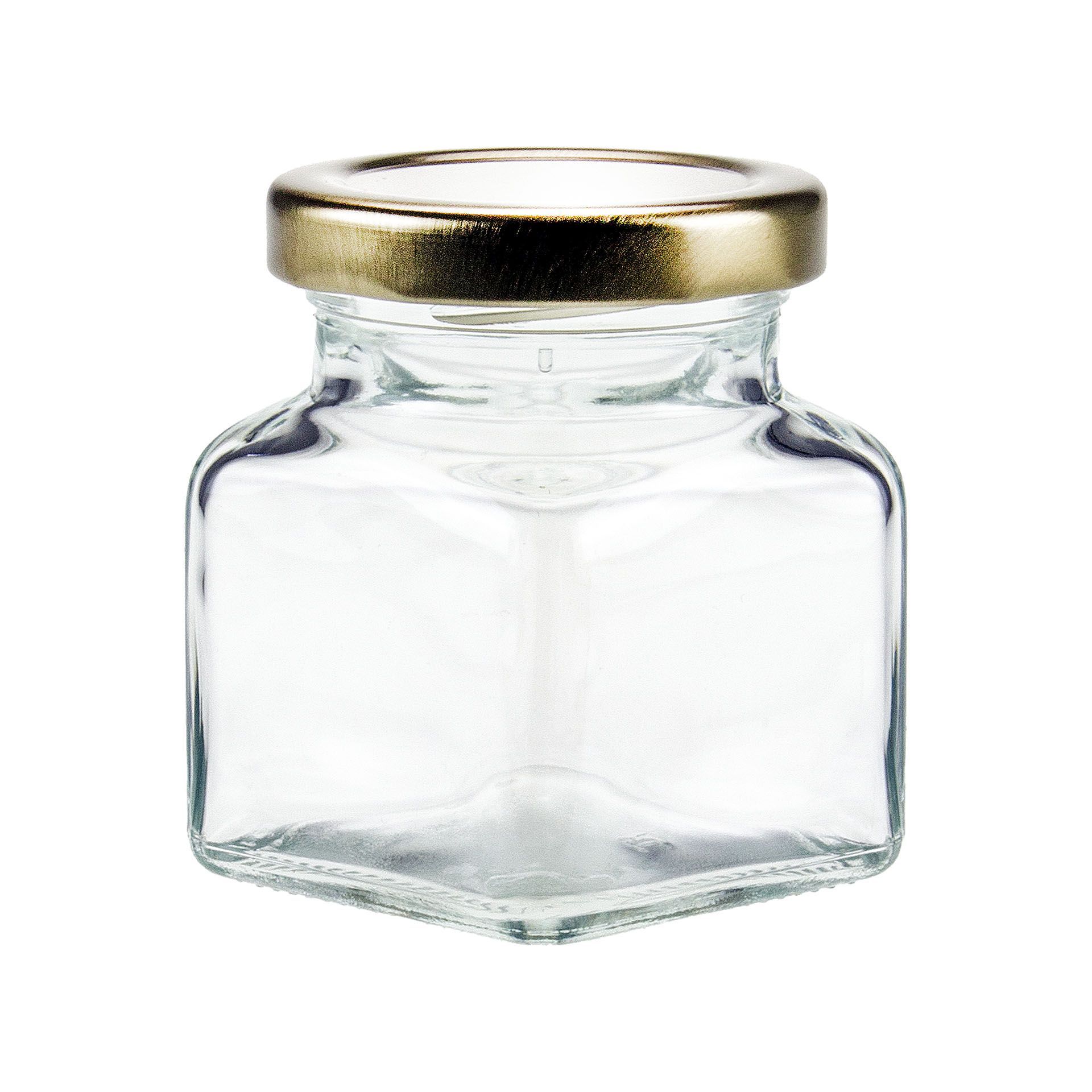 mikken Einmachglas viereckig 106 ml mit Schraubdeckel Dieses eckige Mini-Glas ist vielseitig einsetzbar. Es ist ideal zum Einmachen von kleinen Mengen Marmelade, Gelee, Pasten und vielem mehr. Der Twist-Off Schraubverschluss sorgt für ein luftdichtes Verschließen. Auch zum Abfüllen von Proben und Aufbewahren von Honig, Gewürzen und Salzen sind die klassischen Mini-Gläser perfekt geeignet. Sehr beliebt sind die Gläschen zudem als Geschenk, gefüllt mit kleinen Köstlichkeiten oder zum Verwahren von Kleinteilen. Durch die eckige Form lassen sich die Gläser schön platzsparend verstauen. Material: Korpus aus Glas, Schraubverschluss aus Metall Pflegehinweis: Der Korpus der kleinen Gläser ist spülmaschinengeeignet, der Schraubverschluss ist jedoch per Handwäsche zu reinigen und ist nicht spülmaschinengeeignet. Die Maße des Glases betragen ca.: HöheBreiteTiefeMündungÖffnung ØFüllmenge* 6,7 cm 5,1 cm 5,1 cm TO 48 36 mm 106 ml / 0,11 Liter / 10,6 cl *Info: Die Füllmenge wird bis zur Oberkante des Glasrandes gemessen