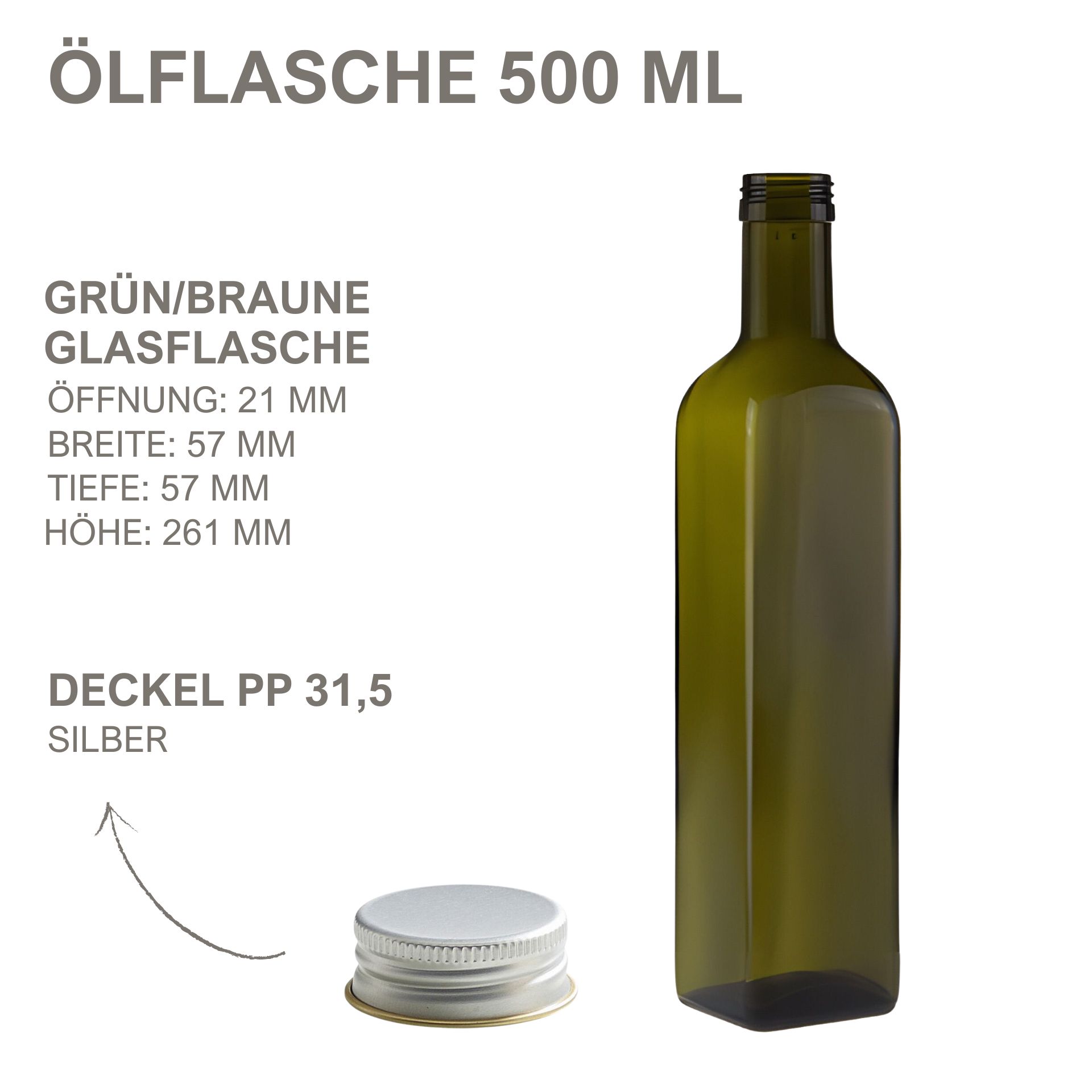 mikken Glasflasche braun 250 ml Ölflasche mit Schraubdeckel Klassische, grün-braune Ölflasche, besonders geeignet für lichtempfindliche Flüssigkeiten.Öle, Liköre, Schnaps, Essenzen und weitere Köstlichkeiten finden hier ihre schützende Verpackung. Auch als Gastgeschenk bei Feierlichkeiten sind die viereckigen Flaschen sehr beliebt und werden ebenso gern zur Dekoration eingesetzt. Durch die eckige Form lassen sich Beschriftungs-Etiketten schön großflächig anbringen und gestalten. Material: Korpus aus Glas, Schraubverschluss aus AluminiumPflegehinweis: Der Korpus der kleinen Glasflaschen ist spülmaschinengeeignet, der Schraubverschluss ist jedoch per Handwäsche zu reinigen und ist nicht spülmaschinengeeignet. Hinweis: Die Farbe kann mal mehr braun und mal mehr grün ausfallen, je nach Charge. Die Maße der Flasche betragen ca.: Höhe Tiefe Breite Mündung Öffnung Ø Füllmenge* 21,3 cm 4,7 cm 4,7 cm PP 31,5 2,1 cm 250 ml / 0,25 Liter / 25 cl * Info: Die Füllmenge wird bis zur Oberkante des Flaschenrandes gemessen