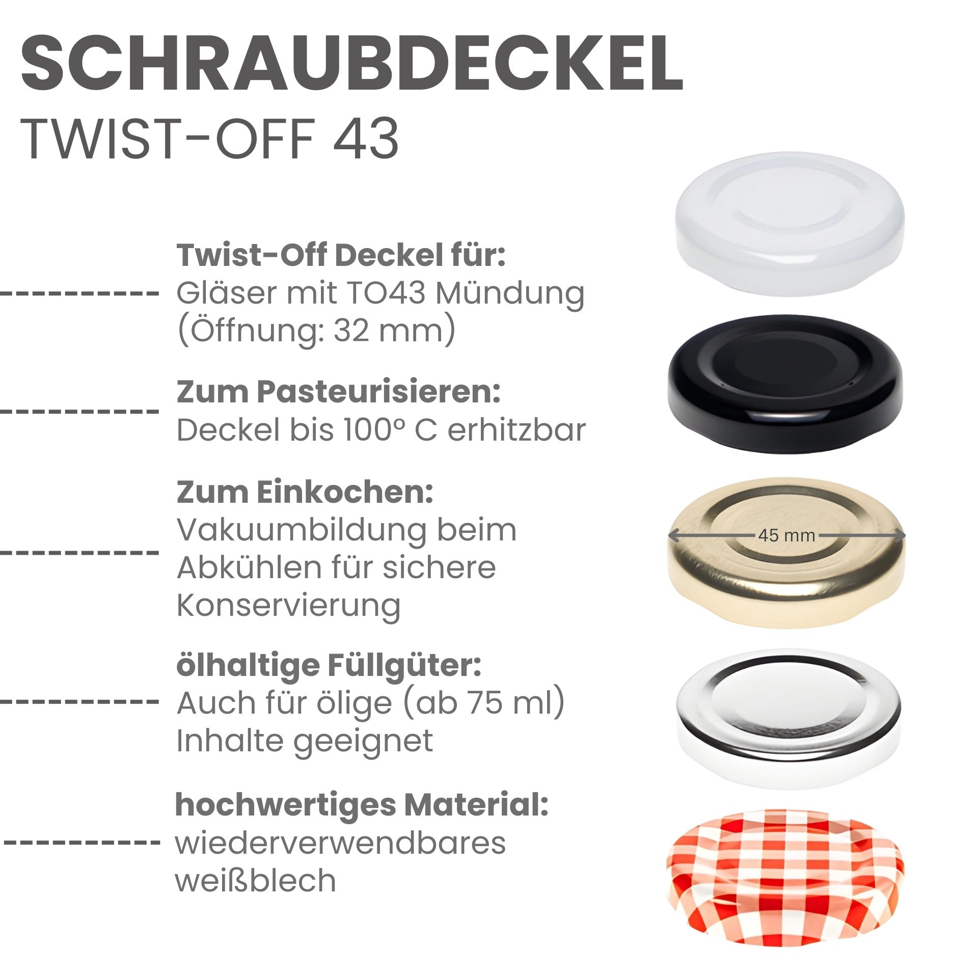 - Twist-Off-Deckel TO 43: Luftdicht verschließend für sichere Aufbewahrung.