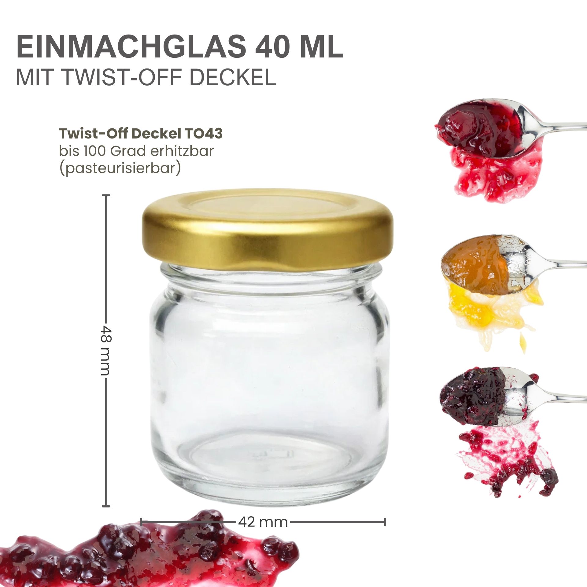 - 10 Mini-Einmachgläser (40 ml): Perfekt für kleine Portionen, Gewürze, Kräuter, Dips oder selbstgemachte Spezialitäten.
