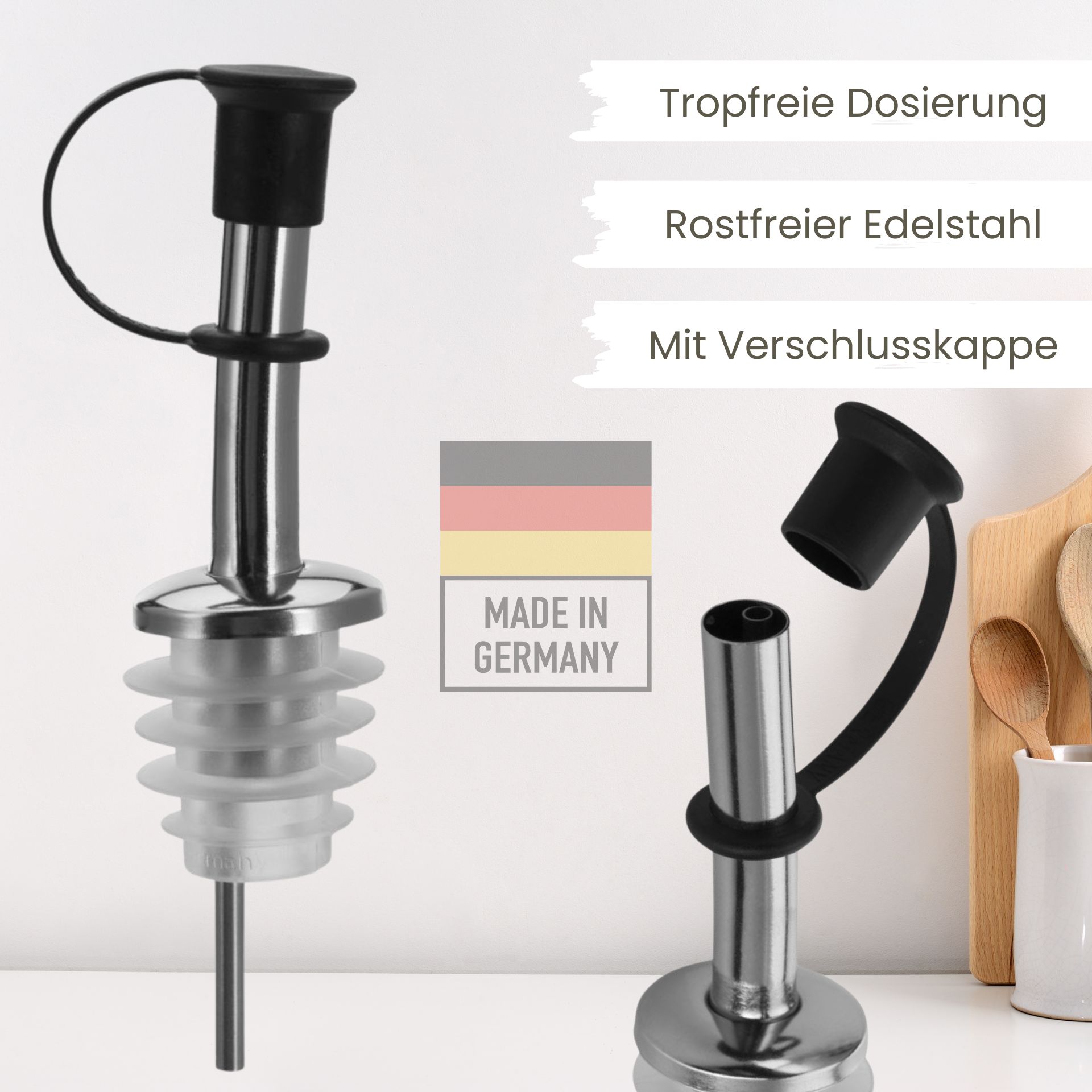mikken Flaschenausgießer mit Klappe Hochwertiger Dosierausgiesser für Öl und Essig - made in germany.Der Flaschenausgießer aus säurebeständigem Edelstahl ermöglicht ein sauberes Dosieren von Öl, Essig, Spirituosen und vielen anderen Flüssigkeiten. Durch das Tropfen-Rückfluss-System werden herunterlaufende Tropfen wieder zurück in die Flasche geleitet, so ist eine saubere Nutzung gegeben. Der Ausgießer ist für alle handelsüblichen Flaschen von 700 ml bis 1 Liter geeignet. Material: rostfreier Edelstahl, Silikon Die Maße des Ausgießers betragen ca.: HöheDurchmesserStopfendurchmesser 5,5 cm 3,1 cm 2,2 cm
