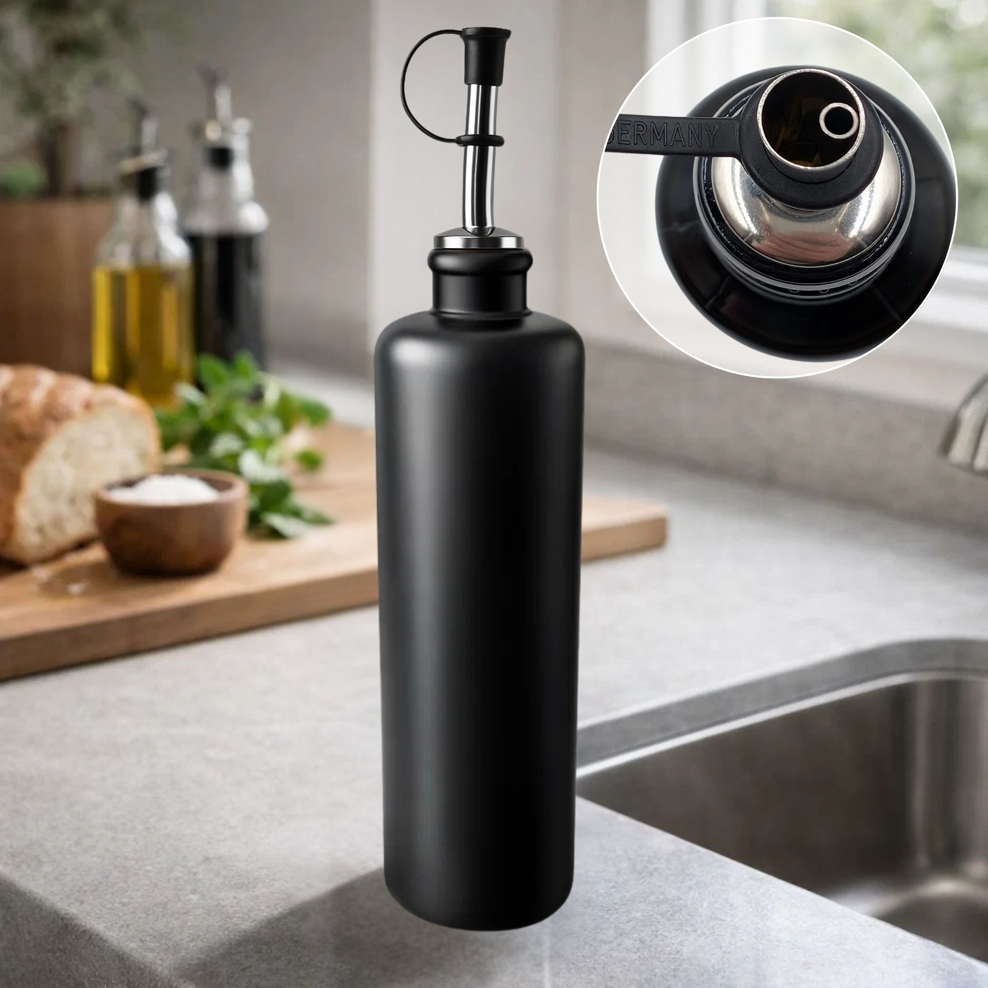 Die in Deutschland gefertigte Keramikflasche wird durch einen ebenfalls in Deutschland hergestellten Ausgießer aus rostfreiem Edelstahl ergänzt. Der Ausgießer mit Silikon-Korken passt auf Flaschenhälse mit einem Innendurchmesser von ca. 18–20 mm und sorgt für präzises, sauberes Ausgießen – auch bei sauren Flüssigkeiten wie Essig.