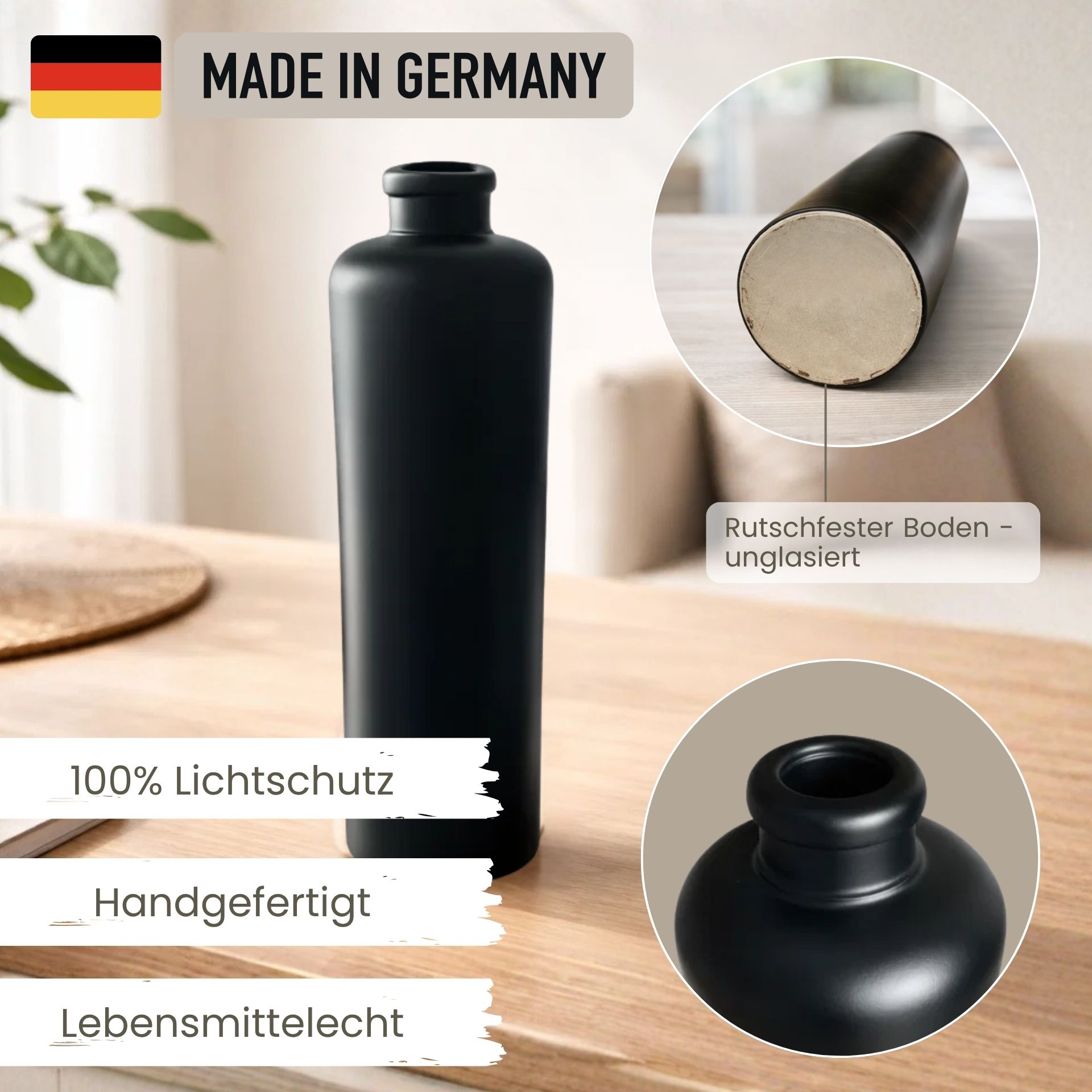 mikken Art Keramikflasche 500 ml schwarz matt – mit Edelstahl-Ausgießer Die mikken Keramikflasche mit 500 ml Volumen kombiniert modernes Design mit praktischer Alltagstauglichkeit. Durch das lichtundurchlässige Steinzeug eignet sie sich ideal zur Aufbewahrung von Öl, Essig, Spirituosen oder anderen Flüssigkeiten und schützt den Inhalt zuverlässig vor äußeren Einflüssen. Qualität aus Deutschland – durchdachte Materialkombination Der stabile Flaschenkörper aus Steinzeug ist besonders widerstandsfähig und langlebig. Ergänzt wird er durch einen hochwertigen Ausgießer aus Edelstahl mit flexiblem Silikonstopfen, der sich optimal an Flaschenhälse mit ca. 18–20 mm Innendurchmesser anpasst. Sauberes Ausgießen ohne Tropfen Der präzise Ausgießer ermöglicht eine gleichmäßige Dosierung. Dank der Kombination aus Edelstahl und Silikon sitzt der Verschluss sicher und sorgt für eine komfortable Anwendung im täglichen Gebrauch. Robust, stilvoll und vielseitig Die matte Oberfläche verleiht der Flasche eine moderne, hochwertige Optik. Gleichzeitig sorgt das Steinzeug für Stabilität und eine angenehme Haptik. Kleine materialtypische Einschlüsse unterstreichen den natürlichen Charakter und machen jede Flasche individuell. Produktdetails im Überblick Material: Steinzeug (matt schwarz), Ausgießer aus Edelstahl mit Silikonstopfen Geeignet für: Öl, Essig, Spirituosen sowie saure Flüssigkeiten Herstellung: Flasche und Ausgießer in Deutschland gefertigt Pflege: Reinigung per Hand empfohlen Maße: Höhe: ca. 21 cm Durchmesser: ca. 6,5 cm Öffnung: ca. 19 mm Füllmenge: 500 ml Funktion trifft auf Design Ob in der Küche oder auf dem Esstisch – die mikken Keramikflasche bietet eine stilvolle Möglichkeit, Flüssigkeiten sauber zu dosieren und gleichzeitig dekorativ zu präsentieren.