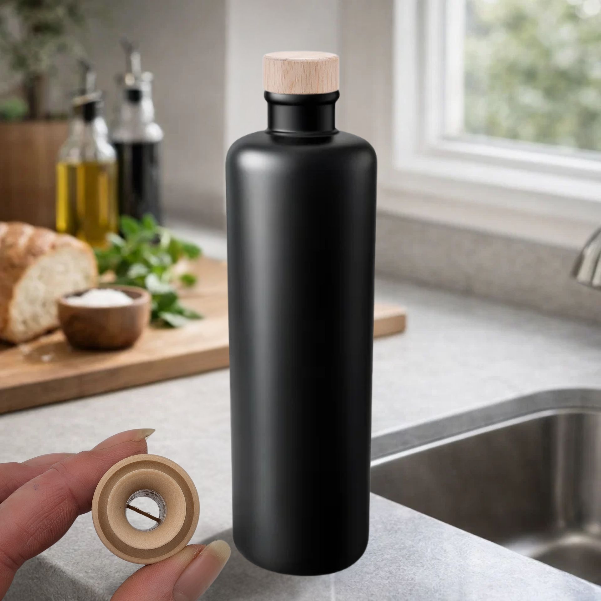 Die hochwertige Holzkappe verschließt die Flasche zuverlässig und bewahrt Geschmack sowie Frische. Gleichzeitig verleiht sie der Flasche eine natürliche, stilvolle Optik und macht sie zu einem echten Blickfang in Küche oder auf dem Tisch.