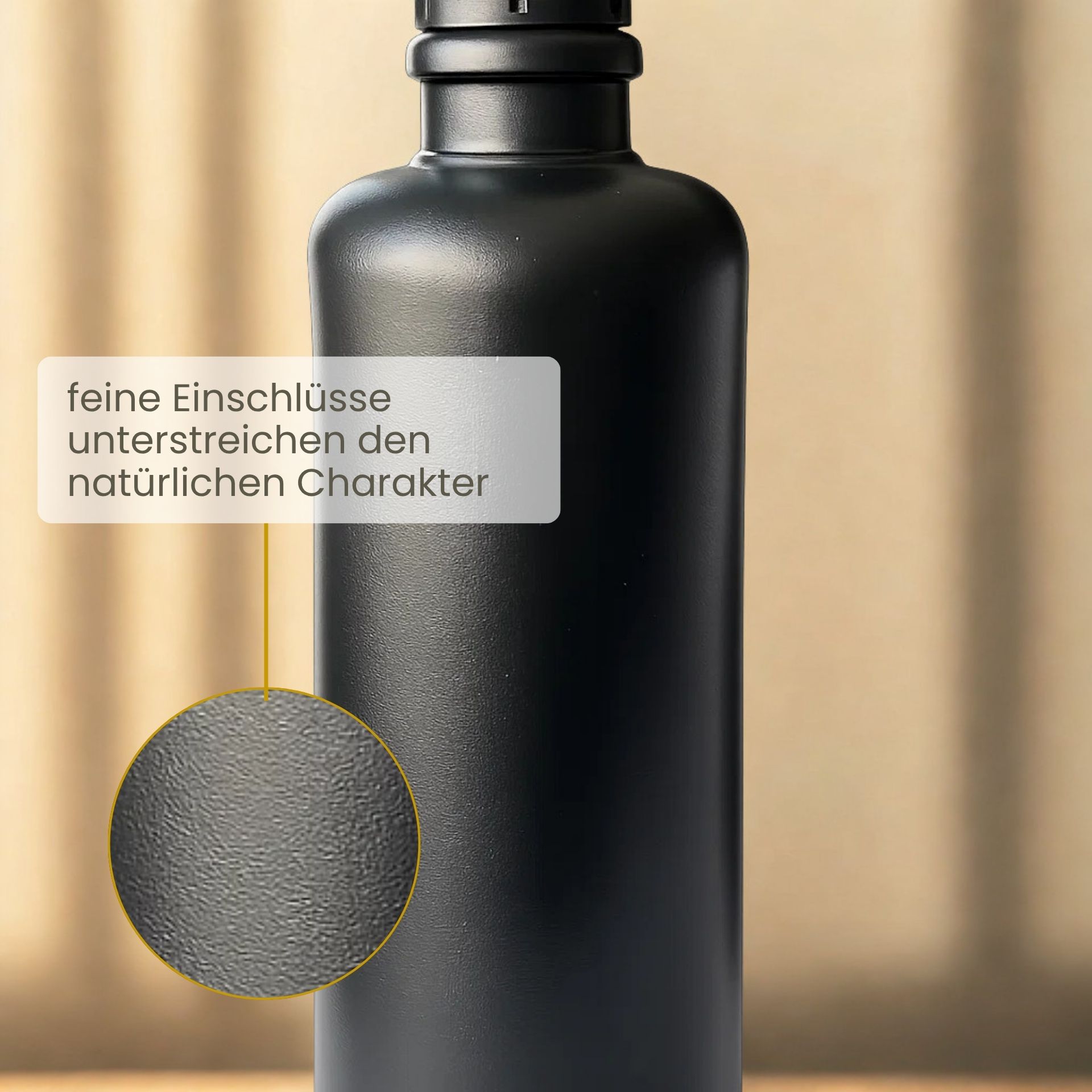 Gefertigt aus robustem Steinzeug überzeugt die Flasche durch ihre hohe Widerstandsfähigkeit und Langlebigkeit. Die matte Oberfläche wirkt edel und modern, während feine materialtypische Einschlüsse den individuellen Charakter jeder Flasche unterstreichen.