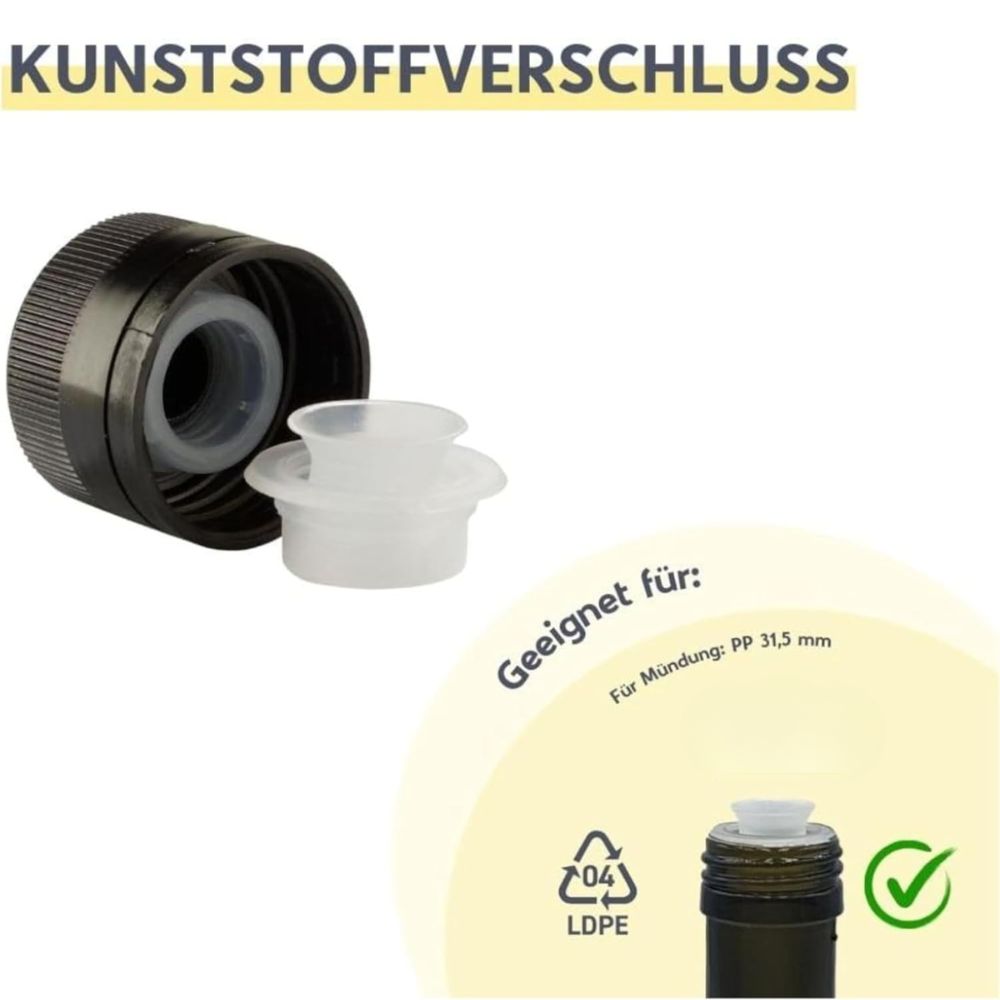Der Flaschenausgießer ermöglicht ein sauberes Dosieren von Öl, Essig, Spirituosen und vielen anderen Flüssigkeiten. Der Schraubdeckel mit Abrissring zur Originalitätssicherung, verhindert das Eindringen von Staub und bewahrt die Aromen des Flascheninhalts. Der Ausgießer ist passend für alle handelsüblichen Flaschen mit einem PP 31,5 Gewinde.