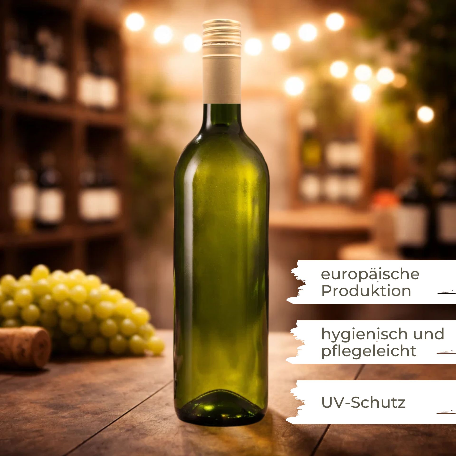 Glasflaschen-Set – 6 x 750 ml grün mit UV-Schutz und Korkverschluss Dieses hochwertige Glasflaschen-Set mit 6 Flaschen à 750 ml eignet sich ideal zum Abfüllen, Lagern und Präsentieren lichtempfindlicher Flüssigkeiten. Dank gefärbtem Glas mit UV-Schutz bleiben Inhalte wie Öl, Likör, Wein oder Essig zuverlässig vor Sonneneinstrahlung geschützt. Set-Inhalt und Vorteile 6 Glasflaschen aus Farbglas (750 ml): Gefärbtes Grün- oder Braunglas mit UV-Schutz – ideal für lichtempfindliche Flüssigkeiten wie Öl, Essig, Likör oder Wein. Korkverschluss mit schwarzer Kappe: Moderner, sicherer Verschluss mit schwarzer Kappe. Vielseitig einsetzbar: Perfekt geeignet für Likör, Schnaps, Spirituosen, Öl, Essig, Sirup oder selbstgemachte Getränke. Warum dieses Flaschen-Set wählen? Zuverlässiger UV-Schutz: Grünglas schützt lichtempfindliche Inhalte effektiv vor Sonneneinstrahlung. Wiederverwendbar und langlebig: Robuste, geschmacksneutrale Glasflaschen für Haushalt und Gewerbe. Ideal für Verkauf und Präsentation: Geeignet für Haushalts, Gastronomie, Manufakturen und Direktvermarktung. Vielseitig nutzbar: Optimal für Abfüllung, Lagerung und stilvolle Präsentation selbstgemachter Produkte. Ob für den privaten Gebrauch, die Gastronomie oder kleine Manufakturen – dieses Glasflaschen-Set bietet die perfekte Kombination aus Funktionalität, Schutz und ansprechender Optik. Maße und Details im Überblick Volumen: 750 ml Material: Grün- oder Braunglas mit UV-Schutz Verschluss: Integrierter Korkverschluss mit schwarzer, eckiger Kappe Höhe: 295 mm Durchmesser: 76 mm Öffnungsdurchmesser: 18 mm Setgröße: 6 Stück