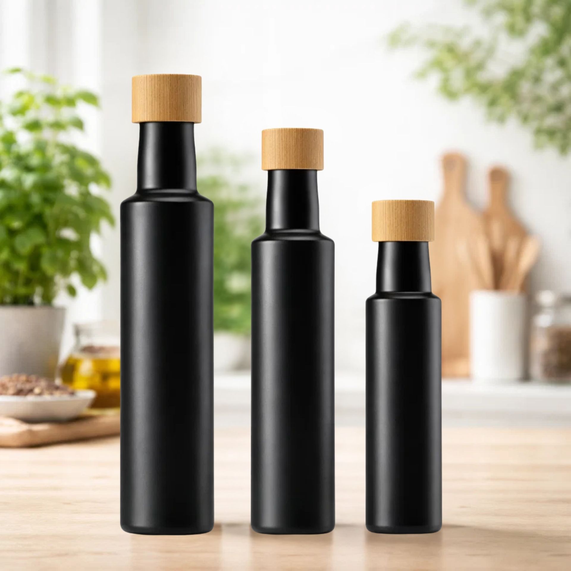 Die mikken Ölflasche Glasflasche matt schwarz, 250 ml mit Holzdeckel vereint modernes Design mit natürlicher Optik und ist ideal für die stilvolle Aufbewahrung von Ölen und anderen lichtempfindlichen Flüssigkeiten.